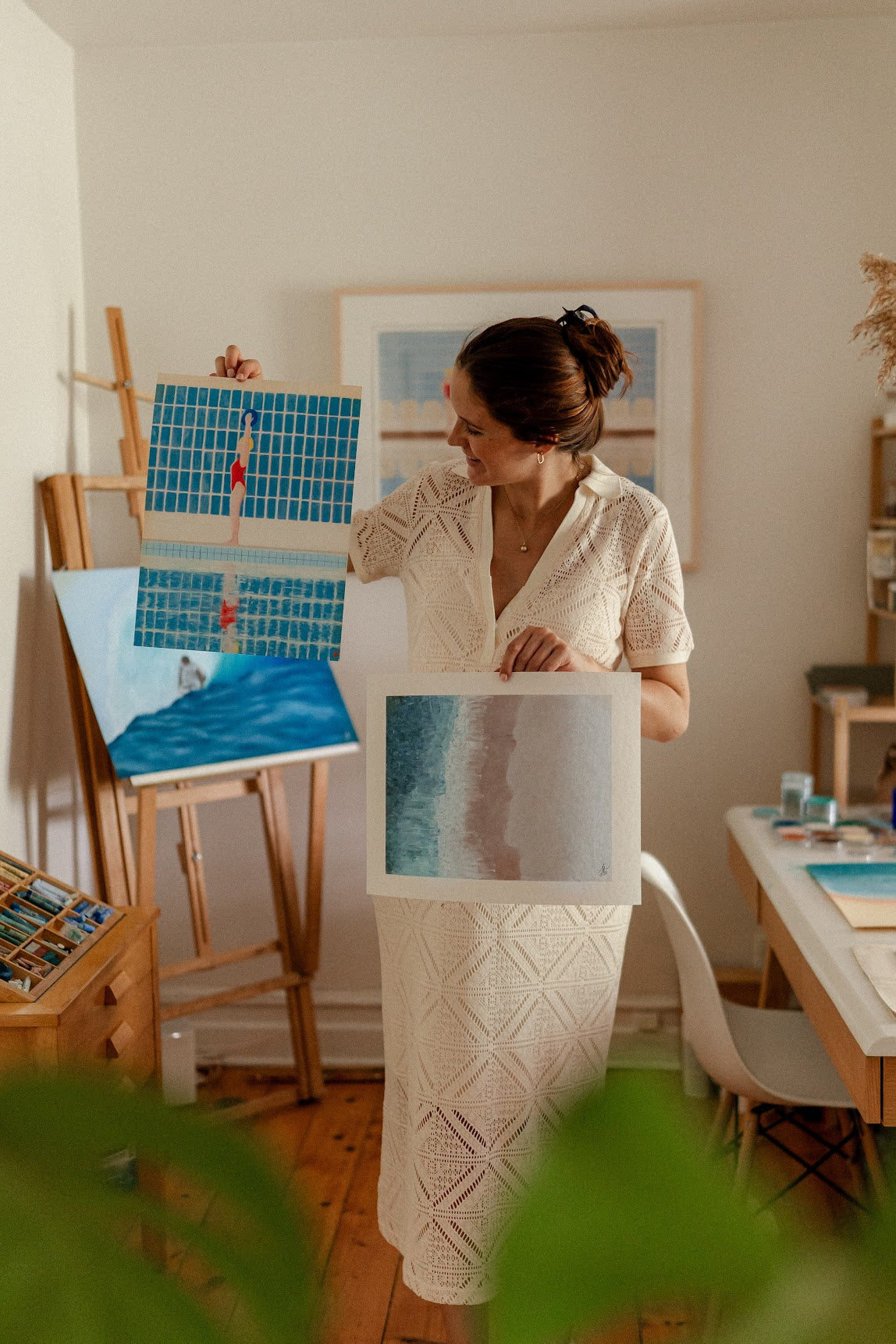 J'explore aussi le thème de la piscine, avec des scènes rétro mettant en scène des baigneuses aux maillots colorés.