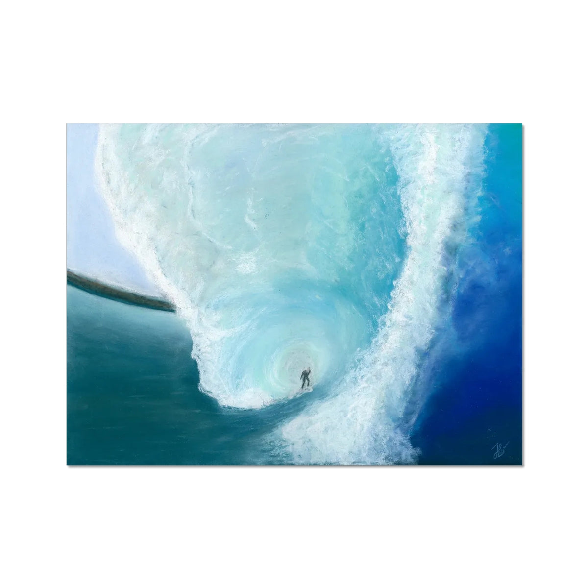 "Surfing in Pastel" montre la liberté d’un surfeur, plongé dans un tourbillon de couleurs. Le pastel met en lumière l’énergie de l’océan et la fluidité des vagues, créant une scène à la fois intime et pleine de vie.